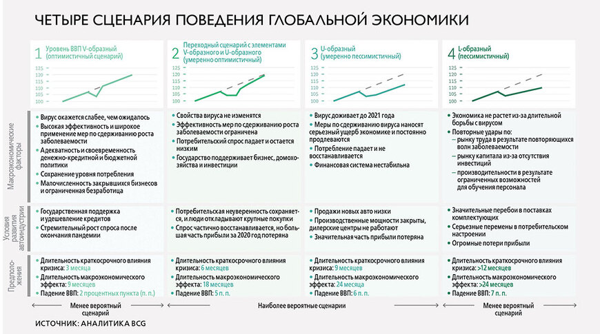 Сильно ли пострадает спрос на автомобили? Для того чтобы ответить на этот вопрос, необходимо попытаться предсказать поведение экономики. Известно, что чаще всего после шоковых событий экономика восстанавливается по одному из трех сценариев. Первый – это V-образное восстановление, когда резкое падение сменяется не менее стремительным ростом. Второй сценарий называется U-образным, при котором экономические показатели какое-то время лежат «на дне» и только потом возвращаются к прежнему уровню. Наконец, третий, самый пессимистичный – L-образный. В этом случае экономический урон настолько серьезен, что рост не восстанавливается вовсе.