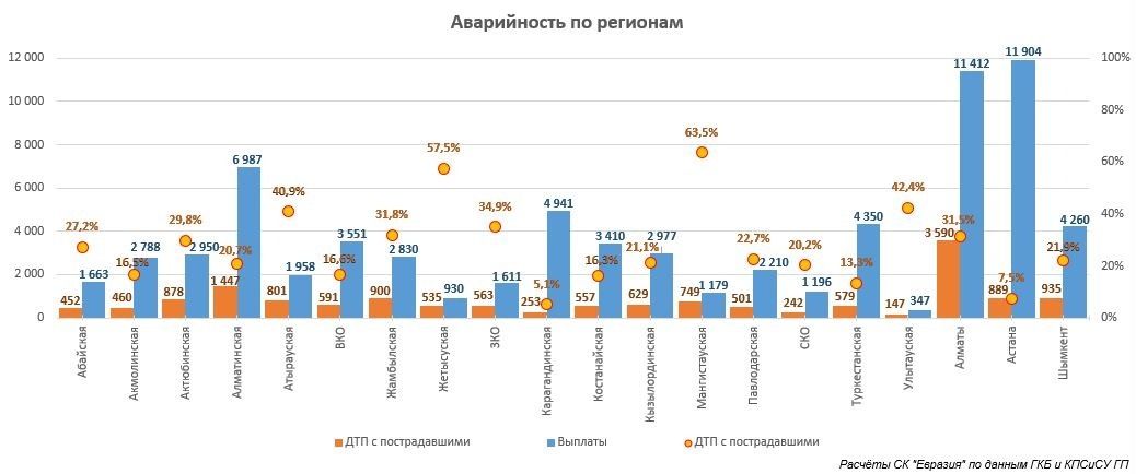 Картина по количеству и тяжести ДТП по Казахстану неоднородная. В ряде регионов отмечается чрезмерно высокий уровень аварий с пострадавшими: так, например, в Мангистауской и Жетысуской областях показатель составляет 63,5 и 57,5% соответственно, то есть травмы получают в каждой второй аварии. При этом в среднем по республике тяжелым является каждое пятое ДТП, или 21,3%. Травматизм выше среднереспубликанского уровня отмечается в Улытау, Атырауской, Западно-Казахстанской, Жамбылской областях и Алматы.