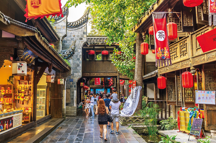 Старые памятники органично вписываются в современный ландшафт города. По соседству с комплексом Ухоуци располагается древний торговый квартал. С наступлением темноты на его узких улочках не протолкнуться от туристов, в первую очередь китайских. Их привлекают не только многочисленные сувенирные лавки и мастерские, но и огромное количество кафе, ресторанов и просто ларьков с уличной едой.