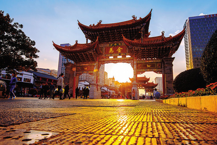 Благодаря активности Хубилая и бойцов так называемой культурной революции в Куньмине за редким исключением практически не сохранилось исторических памятников. В центре города, на улице Цзиньби, находятся арки Золотой лошади и Нефритового петуха, которые были построены 400 лет назад, во время императора Хуань Ди из династии Мин. Арки (12 метров высотой и 18 метров шириной) имеют изящно вырезанные крыши и окрашенные колонны. На них вырезаны самые известные пейзажи Куньмина. Не все в истории этих сооружений было гладко. В период «культурной революции» они были разрушены и восстановлены лишь в 1999 году – в результате сложных математических и астрономических расчетов. До того как их разрушили, местные жители собирались возле арок после полудня в праздник Середины осени в ожидании чуда. В период между пятью и семью часами вечера в день осеннего равноденствия, когда на западе садилось солнце, а на востоке восходила луна, тени двух арок встречались. Куньминцы называли это явление «цзиньбицзяохуэй» – соединение света солнца и луны. Очень поэтично. Происходило это лишь раз в 60 лет. А поскольку в исторических записях не указано точных дат, когда происходило это явление, не известно, когда оно может случиться вновь. Но люди ждут.