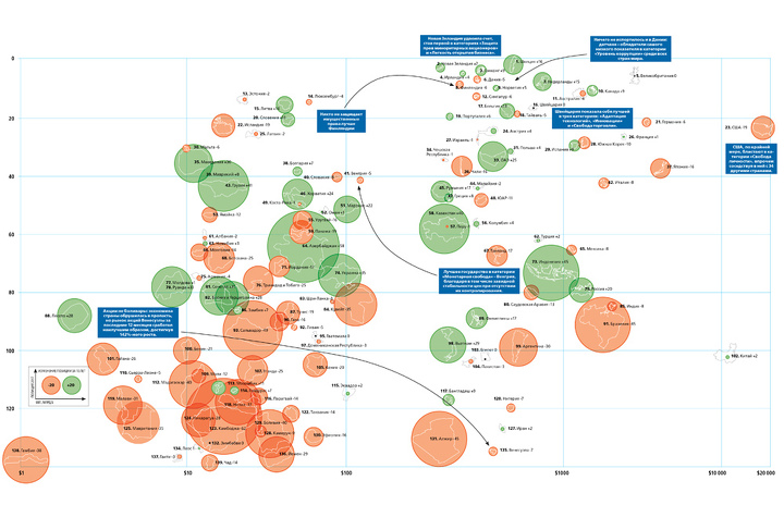 Приводимая инфографика показывает текущий ренкинг стран и их ВВП; при этом размер «пузыря» отображает изменение позиции за последнее десятилетие. Посмотреть инфографику в высоком разрешении можно по этой ссылке (0,41 Мб).