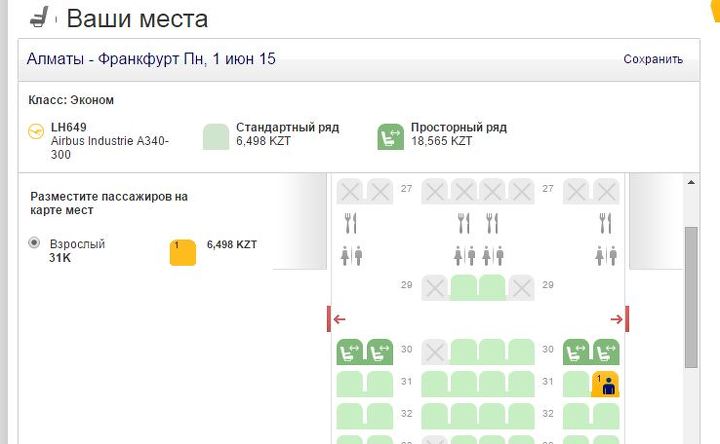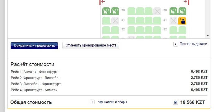 Обозреватель Forbes.kz решил проверить информацию, для примера забронировав на сайте авиакомпании билет по маршруту Алматы-Франкфурт-Лиссабон. На деле выяснилось, что Lufthansa.com при покупке билета предлагает на выбор два типа кресел – на стандартном и просторном рядах (у аварийного выхода). Причем плата взимается за каждый полетный сегмент (взлет-посадка).