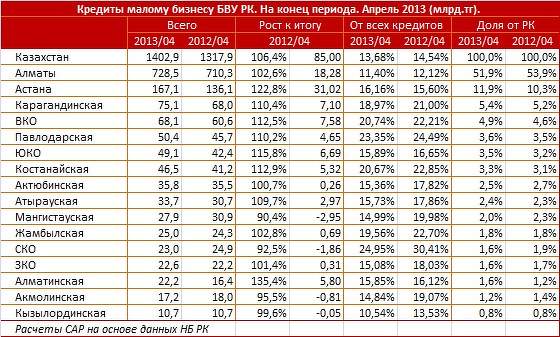 Кредиты БВУ малому бизнесу в регионах РК (данные на апрель 2013)
