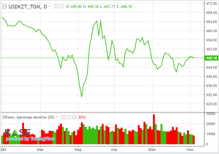На сегодняшней сессии пара USDKZT (10:27 ALA) торгуется на уровне 448,45 тенге за доллар.