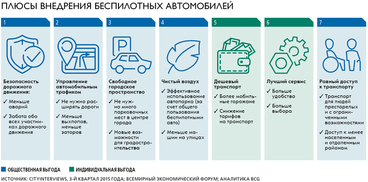 Конечно, есть и потенциальные проблемы. Одна из них – финансирование инфраструктуры, необходимой для внедрения беспилотных автомобилей. Государственным органам и частным компаниям предстоит разработать новую модель налогообложения, найти удобные формы партнерства. По расчетам BCG и ВЭФ, создание современной системы управления дорожным движением в городе с населением 10 млн человек обойдется в сумму, превышающую $5 млрд.