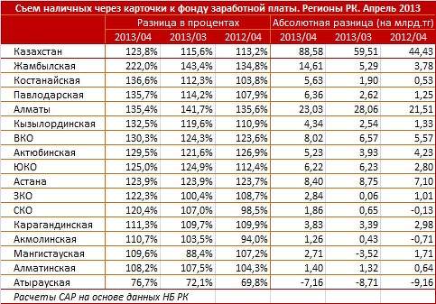Снятие наличных через платежные карточки в регионах Казахстана (данные на апрель 2013)