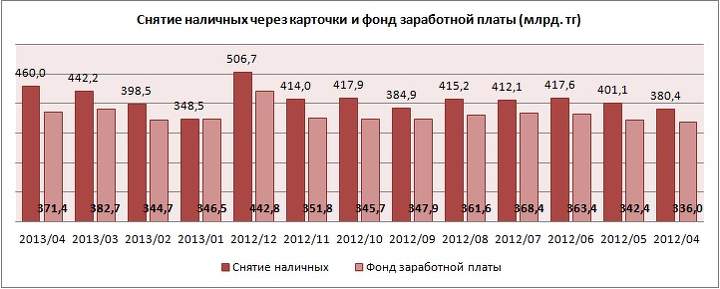 В апреле держатели карточек обналичили 460 млрд тенге, в то время как весь зарплатный фонд республики составил 371 млрд. Разница - почти 24%.