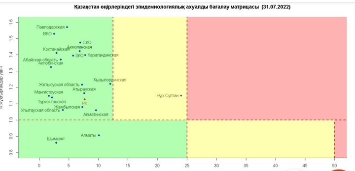 По данным матрицы оценки эпидемиологической ситуации в регионах Казахстана на 31 июля 2022 года: