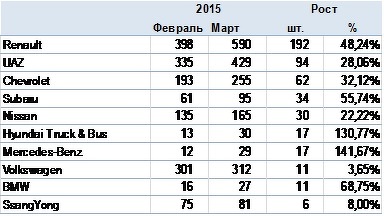 Среди легковых автомобилей наибольший рост продаж в количественном выражении показали по сравнению с февралем модели Renault. Вклад в рост продаж внесли автомобили казахстанского производства под брендом Chevrolet. Также в пятерку лидеров вошли бренды UAZ, Subaru, Nissan.