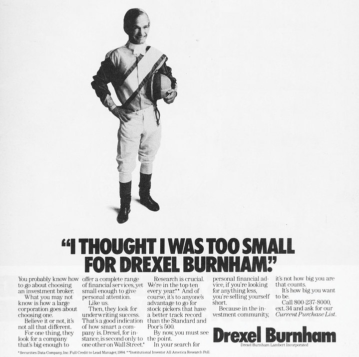 Инвестиционный банк Drexel Burnham Lambert, ставший известным благодаря Майклу Милкену, никак нельзя было назвать маленьким. Доходы этого финансового института достигли $150 млн (около $360 млн сегодня), означая рост в 2400% меньше, чем за десятилетие.