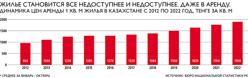 28 сентября другой сервис, Krisha.kz, опубликовал данные об изменении цен на рынке. Так, согласно анализу его специалистов, в среднем в Алматы за однокомнатную квартиру арендодатели стали просить 220 тыс. тенге, а за двухкомнатную – не меньше 350 тыс. В Астане – 180 тыс. и 250 тыс. соответственно. Поразили ценами и приграничные с РФ города – в Костанае аренда «однокомнатки» подскочила до 200 тыс., в Уральске – до не менее чем 170 тыс. «Городами с максимальным ростом спроса остаются Уральск, Актобе, Костанай, Петропавловск, Павлодар. Именно в этих городах наблюдается наибольший рост цен, до 50%. Также есть регионы, где арендная плата и спрос почти не изменились. Это Шымкент, Туркестан, Тараз, Кокшетау», – отметили эксперты.