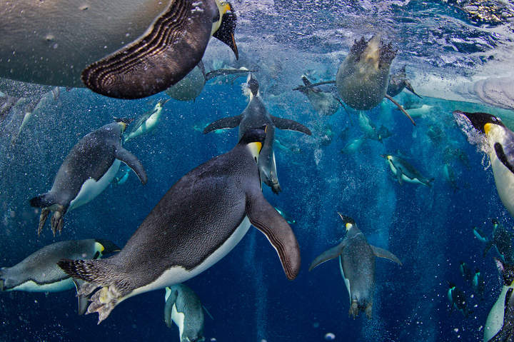 18 ноября 2011 года, море Росса, Антарктика. Самая большая проблема, угрожающая пингвинам, — это таяние льдов, от которых зависит и жизнь их колонии, и окружающая экосистема. Последние научные исследования показали, что императорские пингвины могут увеличивать свою скорость в воде втрое за счет миллионов пузырьков, которые они выпускают из своих перьев. Эти пузырьки уменьшают трение между перьями и ледяной водой. Двигаясь со скоростью 30 километров в час, пингвины спасаются от морских леопардов и выпрыгивают на лед.