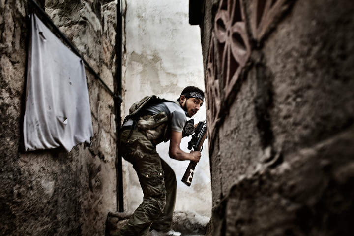 10 октября 2012 года, Алеппо, Сирия. Боец Свободной сирийской армии занимает позицию во время сражений с правительственными войсками в районе Сулейман Халаби.