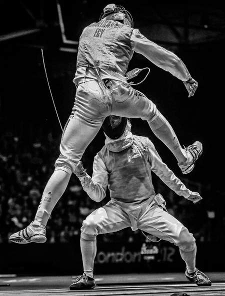 31 июля 2012 года, Лондон, Великобритания. Египтянин Алаа-эль-Дин Абу-эль-Кассем (вверху) сражается с немцем Петером Йоппихом во время 16-го раунда соревнований по мужскому фехтованию. Годы тренировок, тысячи схваток и сотни побед позволили фехтовальщикам принять участие в Олимпийских играх в Лондоне и сразиться за золотую медаль.