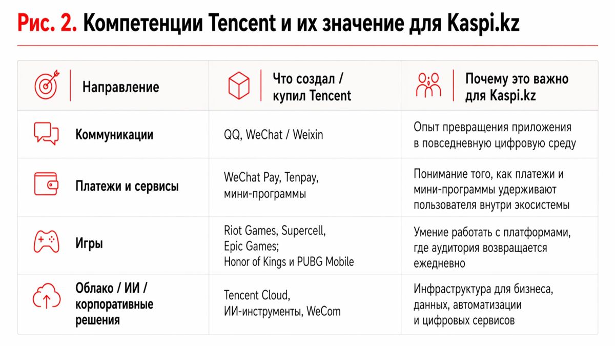 Эти сделки объясняют, почему участие Tencent в Kaspi.kz читается стратегически. Tencent умеет находить платформы с высокой вовлеченностью и сетевым эффектом: Riot дал ей глобальный esports и League of Legends, Supercell — мобильный gaming, Epic — доступ к Unreal Engine и Fortnite-экосистеме, WeChat Pay и Mini Programs — платежи и повседневные сервисы внутри одного приложения. Kaspi.kz отличается по модели, но похож по главному признаку: пользователь возвращается туда не раз в месяц, а ежедневно.