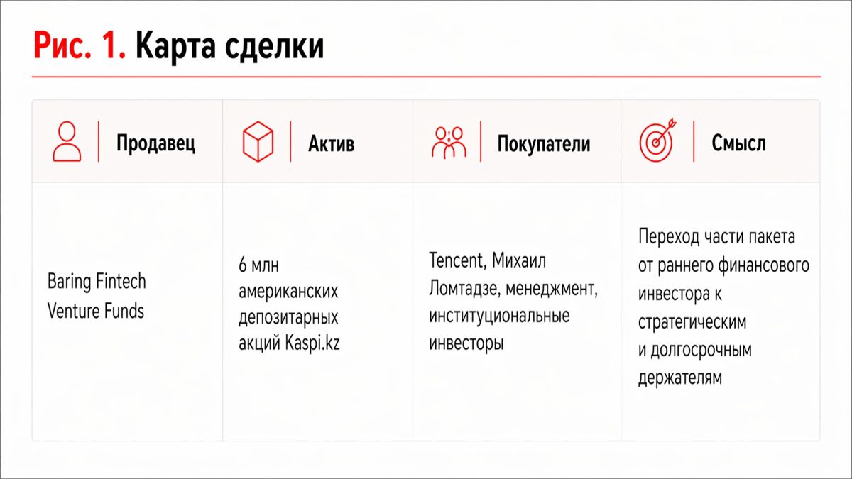Kaspi.kz объявила, что Tencent, сооснователь и CEO Kaspi.kz Михаил Ломтадзе, ключевые члены менеджмента и долгосрочные институциональные инвесторы завершили покупку 6 млн американских депозитарных акций Kaspi.kz у Baring Fintech Venture Funds. В числе новых долгосрочных инвесторов также названы Spice Expeditions, Washington University и WISIMCO / University of Wisconsin Foundation. Morgan Stanley выступил эксклюзивным финансовым советником фондов Baring по сделке.