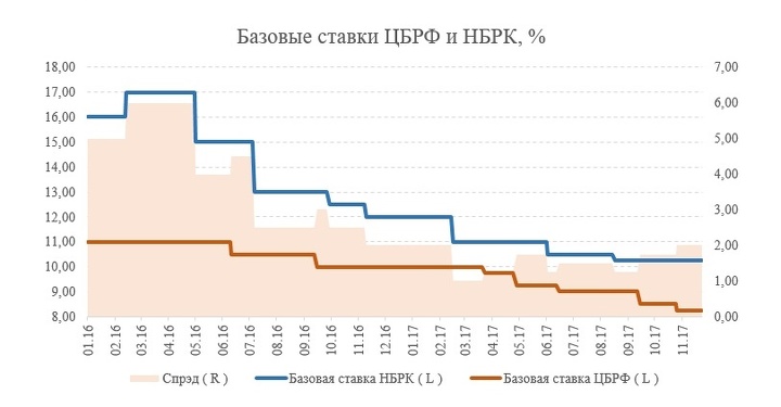 О следующем решении по базовой ставке НБРК будет объявлено уже в следующем году, 15 января. Совет директоров российского центробанка примет очередное решение 15 декабря текущего года, в отношении которого банк допускает возможность дальнейшего снижения ключевой ставки, что может соответствующим образом повлиять на разницу ставок в Казахстане и России, а также курсы национальных валют.