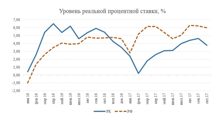Индикативный уровень реальных процентных ставок снизился (базовая ставка минус эсктраполированная инфляция) и, по-прежнему, остается ниже, чем в России.