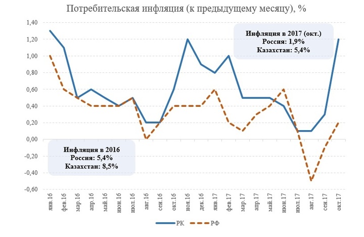 30 октября Центральный банк России принял решение о снижении базовой ставки на очередные 25 базисных пунктов (до 8,25%). Ослабление монетарной политики в России, если и не стало причиной, то явно поспособствовало соответствующему движению российского рубля против доллара. Курс казахстанского тенге в этот период оказался более стабильным. Однако, указанный рост инфляции и соответствующие ожидания не позволили регулятору действовать более решительно в ослаблении монетарной политики, несмотря на положительную динамику нефти и пары USDKZT в последние несколько месяцев.