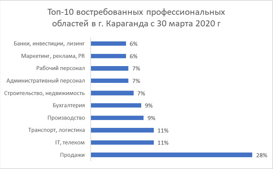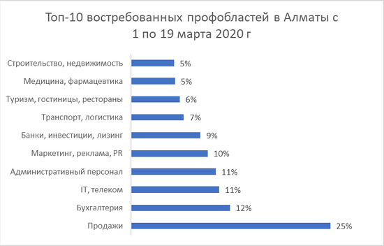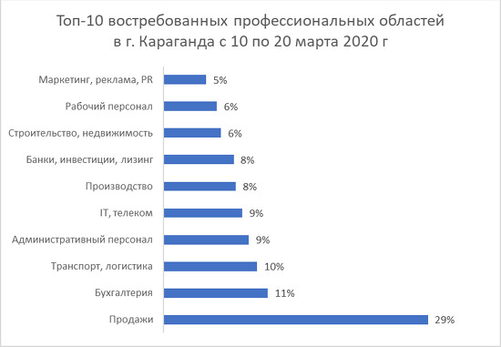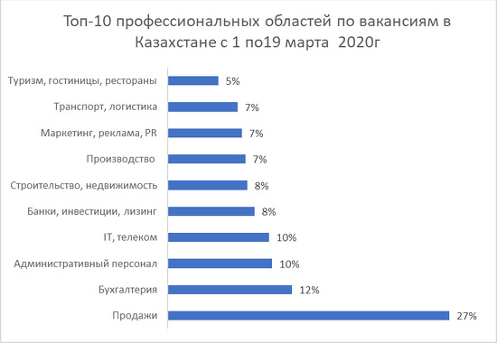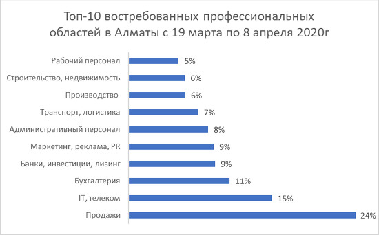 После введения карантина увеличился спрос также на IT-специалистов, и эта профессиональная область поднялась до второго места в списке. «Производство» поднялось с 7 места до 5. А продажи уверенно возглавляют рейтинг», - заключают в HeadHunter Казахстан.