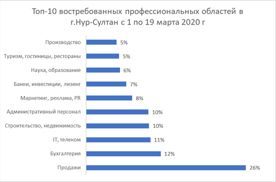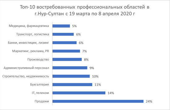 В Нур-Султане с момента введения карантина области «Медицина, фармацевтика» и «Транспорт, логистика» вошли в топ-10 востребованных профессиональных областей. Ранее они в десятку лидеров не входили.