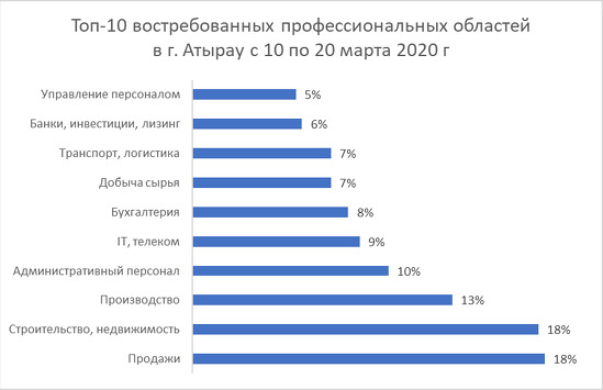 В Атырау, по данным HeadHunter Казахстан, с момента введения карантина повысился спрос на IT-специалистов и рабочий персонал. Снизилось количество вакансий в профессиональных областях «Добыча сырья» и «Административный персонал».