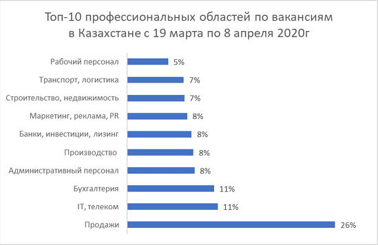 «В целом, сравнивая показатели hh.kz по Казахстану в марте - апреле 2020, мы видим, что профессиональная область «Рабочий персонал» после введения карантина вошла в десятку востребованных профобластей со стороны работодателей, тогда как на их месте еще в начале марта 2020 находилась профессиональная область «Туризм, гостиницы, рестораны».