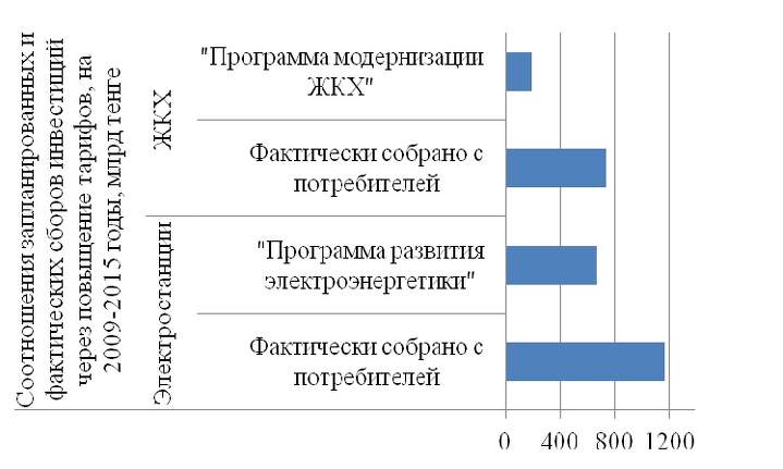 Аналогичная ситуация – и с предельными тарифами, введенными для инвестирования ввода генерирующих мощностей. Реально предельные тарифы утверждены с двукратным перевыполнением: до 2015 МИНТ планирует собрать 1162,6 млрд тенге – в 2 раза больше, чем предусмотрено в программе. Фактически за 2009-2012 уже собрано более 700 млрд тенге. На эти средства предполагается ввести 1635 МВт, а всего в 2009-2015 - 3010 МВт дополнительных мощностей.