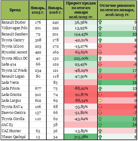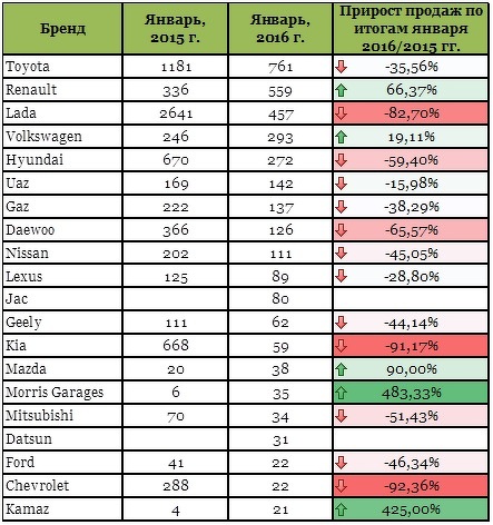 Первое место по количеству реализованных автомобилей занимает Toyota - 761 авто; рост 27,47% по сравнению с предыдущим месяцем (597 единиц). На втором месте - бренд Renault с ростом продаж в годовом выражении на 66,37% (559 автомобилей проданных в январе 2016 против 336 в январе 2015), в месячном выражении спад составил 34%.