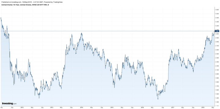 Доходность 10-летних гособлигаций США во вторник поднялась до уровня 3,07%, обновив максимум за 7 лет. В то же время доходность двухлетних государственных облигаций США, которые более чувствительны к изменениям денежно-кредитной политики, выросла до 2,56% — наивысшего значения с 2008 года, а доходность 30-летних государственных облигаций достигла отметки 3,191%. Отмечаем, доходность указанных бондов выросла после выхода отчёта по объёму розничных продаж в США за апрель. В частности, отчёт указал на восстановление роста потребительских расходов после слабых показателей первого квартала. Так, объём розничных продаж в США в апреле в месячном выражении вырос на 0,3% (аналитики Bloomberg ожидали роста показателя на 0,3%), а его значение за март было пересмотрено в сторону роста до 0,8% против предварительного значения на 0,6%. Розничные продажи являются одним из важнейших показателей состояния экономики США, так как на потребительские расходы приходится около 70% ВВП страны. Инвесторы опасаются, что указанный рост потребительских расходов приведет к ускорению инфляции, что в свою очередь может привести к ужесточению денежно-кредитной политики ФРС.