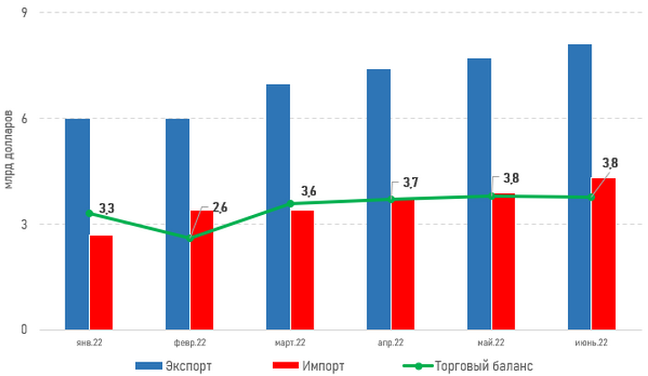 Из опубликованной статистики отметим, что, по предварительным данным БНС АСПР РК, в январе - июне 2022 года внешнеторговый оборот РК составил $63,7 млрд  и по сравнению с аналогичным периодом 2021 года увеличился на 39%, в том числе экспорт – $42,2 млрд (+56,3%), импорт – $21,5 млрд (+14,8%).