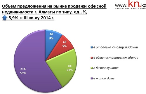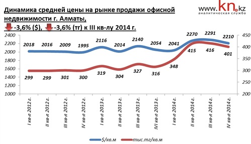 В сегменте продажи офисной недвижимости в течение 2013 цены повысились на 3,6%. В 2014 средние цены предложения повысились уже на 5,8% в долларах и на 24,6% в тенге, при этом основной рост цен пришелся на II квартал 2014.