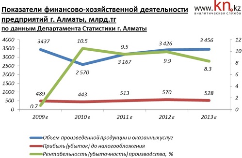 Из анализа показателей финансово-хозяйственной деятельности предприятий Алматы видно, что в течение 2011-2012 происходил небольшой рост объемов произведенной продукции и оказанных услуг, а также зафиксировано увеличение прибыли предприятий по налогообложению. В целом деятельность хозяйствующих субъектов города остается доходной. По итогам 2013 рентабельность производства составила 8,3%. Во II квартале 2014 уровень рентабельности составил 9,3%. Объем произведенной продукции и оказанных услуг во II квартале 2014 – 923,6 млрд тг., прибыль (убыток) до налогообложения – 167,4 млрд тг.