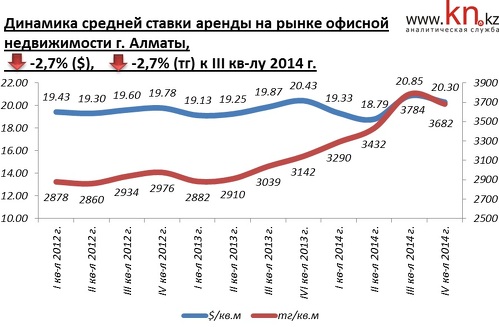 В динамике на рынке аренды коммерческой недвижимости в течение 2013 ставки найма офисных площадей были достаточно стабильными, годовое повышение составило 0,7%. В 2014 годовое повышение в долларовом эквиваленте также составило 0,7%, однако в тенге арендные ставки выросли на 18,4%.