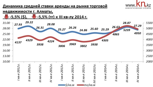Арендные ставки на рынке торговой недвижимости в 2013 сократились на 8,5%. В 2014 наблюдался рост аренды на 5,9% в долларах и на 24,5% в тенге. В IV квартале 2014 средняя арендная ставка на торговые площади зафиксирована на уровне $27,3/кв.м за месяц, снижение аренды по отношению к III кварталу 2014 составило 5,5%.