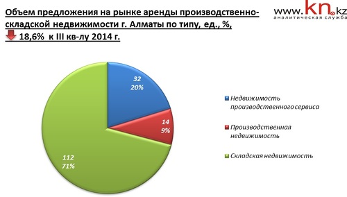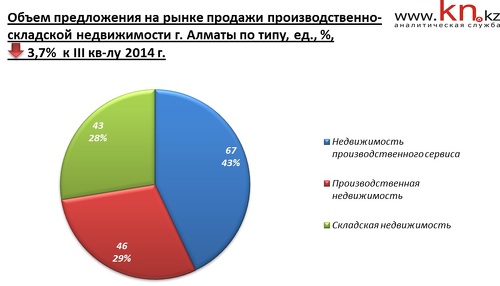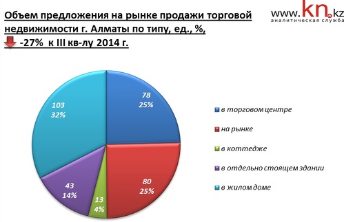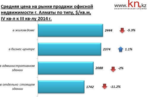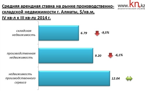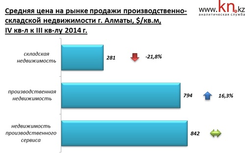 - В IV квартале 2014 на рынке продажи коммерческой недвижимости Алматы снижение цен отмечено в сегменте офисной и складской недвижимости. На рынке торговой недвижимости наблюдается ценовое затишье, а на рынке производственной, напротив, рост цен.