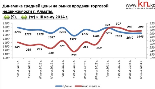 В секторе торговой недвижимости в 2013 было зафиксировано незначительное сокращение средних цен предложения, основной спад цен пришелся на II квартал. Годовое снижение составило 1,6%. В 2014 средние долларовые цены предложения не изменились, однако тенговые цены выросли на 17,2%, при этом основной рост пришелся на I квартал 2014.