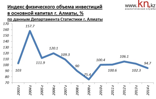 В динамике индекса объема инвестиций в основной капитал прослеживается снижение показателя. В 2014 объем инвестиций в основной капитал составил 510728,4 млн тенге, что на 5,3% меньше, чем в 2013. Доля инвестиций в основной капитал, освоенная предприятиями и организациями города Алматы, составила 7,8% от республиканского объема.