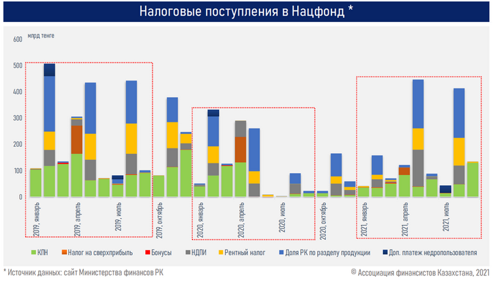 - За январь - сентябрь 2021 года было собрано 9 трлн тенге налогов, что на 31% или 2,1 трлн тенге выше в сравнении с аналогичным периодом прошлого года. Суммарные доходы КБ составили 10,6 трлн тенге (+23%).