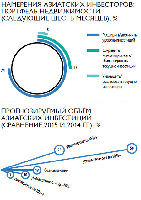 По словам экспертов Colliers, в этом году благодаря стабильным долгосрочным экономическим показателям инвесторы ожидают двузначного прироста в объеме инвестиций в Азиатский регион. По мнению опрошенных, уменьшение объемов в 2014 было главным образом связано с неопределенностью экономического роста и рядом ограничений со стороны правительств. Однако в связи со стабилизацией ситуации в 2015 ожидается увеличение потоков капитала.