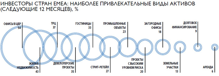 Самыми инвестиционно привлекательными странами ЕМЕА среди респондентов стали Великобритания (35%), Германия (21%) и Франция (12%), далее следуют Испания (9%) и Нидерланды (9%). В отношении городов самым желанным направлением остается Лондон. Сами инвесторы из ЕМЕА в дополнение к Лондону предпочитают Берлин (22%), Париж (16%), Мадрид (10%) и Нью-Йорк (18%).