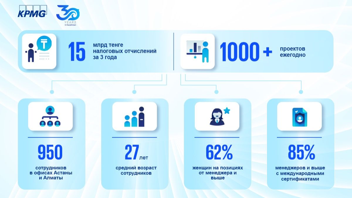 За 30 лет через компанию прошло около 5000 специалистов, которые сегодня востребованы на рынке и занимают высокие позиции в различных сферах экономики, подчеркивает Сакен. Средний возраст сотрудников KPMG — 27 лет. «Раньше я считал, что страну двигают люди с большим опытом и багажом знаний. Но история показывает, что будущее формируется молодым поколением. Именно молодежь сегодня выступает драйвером изменений. Ее отличает особый креатив и высокая адаптивность к передовым технологиям. Эта энергия нового поколения сейчас меняет облик нашего государства».