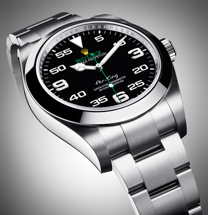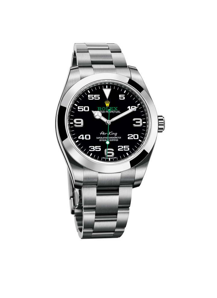 Oyster Perpetual Air-King продолжает авиационное наследие первых часов Rolex Oyster и отражает тесную связь компании Rolex с миром воздухоплавания, которая зародилась в 1930-е – годы становления авиации. Яркая особенность новой модели Air-King из стали 904L – черный циферблат с крупными цифрами 3, 6 и 9 и отчетливой минутной разметкой, по которой удобно определять время в полете. Циферблат выполнен в том же оригинальном стиле, что и на исторической модели 1950-х годов.