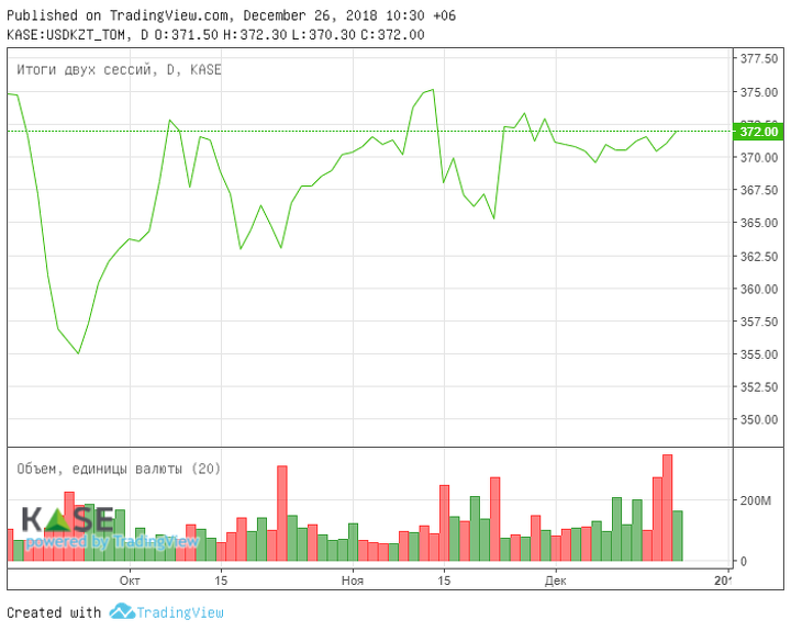Биржевой курс доллара США за два рабочих дня до конца текущего года консолидируется вблизи уровня 375 тенге, что на 5,93 тенге ниже годового максимума. Так, по итогам валютных торгов четверга пара USDKZT выросла на 1,59 тенге, до уровня 375,15 тенге за доллар. При этом объём торгов немного увеличился и составил $155,5 млн (+20,0%). Хотим отметить, что нацвалюта вчера двигалась в одном направлении с ключевыми внешними факторами - динамикой цен на нефть и российским рублём. Вместе с тем с начала года курс доллара против нацвалюты демонстрирует рост на 13% с уровня 332,33 тенге за доллар.