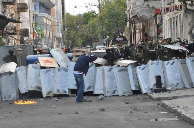 Активисты украинской ультранационалистической организации "Правый сектор" и примкнувшие к ним футбольные фанаты вступили в столкновение с одесситами, вышедшими на центральные улицы города в поддержку Славянска.