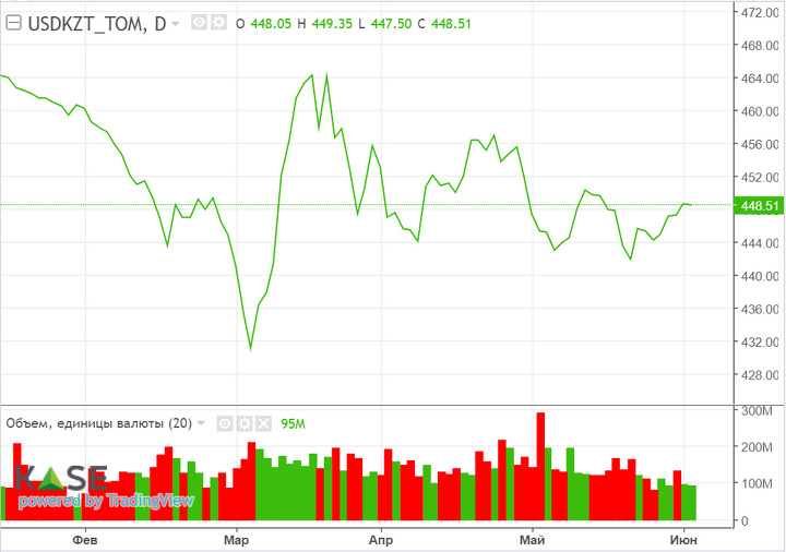 По итогам биржевых торгов пятницы, 2 июня, курс по паре USDKZT снизился до отметки 448,16 тенге за доллар (-0,51 тенге) при низкой торговой активности ($94,5 млн). Поддержку нацвалюте, вероятно, оказывала дорожающая нефть и растущий риск-аппетит глобальных инвесторов на фоне разрешения вопроса с потолком госдолга США. Спрос на тенге мог также быть связан с приобретением ГЦБ нерезидентами, тогда как дополнительное предложение по-прежнему обеспечивается обязательной продажей валютной выручки КГС и конвертацией трансфертов из Нацфонда.