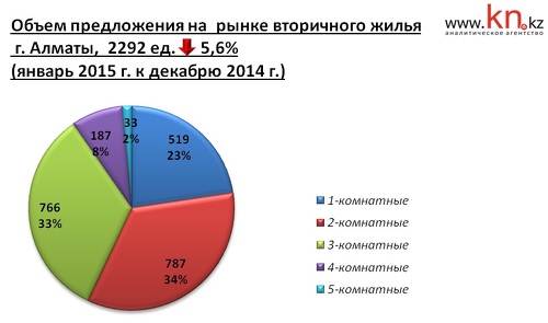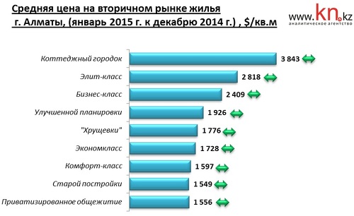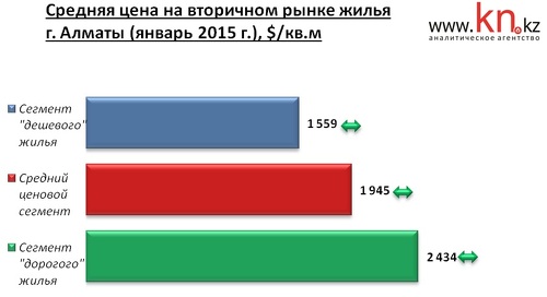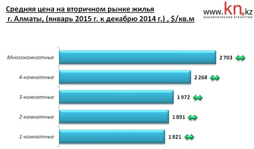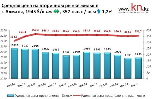 На рынке вторичного жилья Алматы из-за увеличения курса доллара со 181,81 тенге в декабре 2014 до 184,45 тенге в январе 2015 наблюдается рост тенговой цены на 1,2%. Изменения средней долларовой цены не превысили погрешности расчетов. По отношению к додевальвационному показателю снижение долларовой цены составило 4,3%.