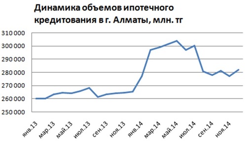 Несмотря на рост объемов ипотечного кредитования (плюс 10% к 2013), являющегося одним из главных факторов роста цен, давление на которые продолжают оказывать снижение стоимости нефти, дестабилизация экономики России, падение курса рубля, а также слухи о новой девальвации национальной валюты. Как показано на диаграмме, с мая 2014 объемы ипотеки в Алматы имеют выраженную тенденцию снижения.