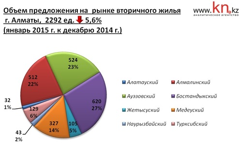 Исследуемое количество объектов, по данным kn.kz, составило 2292 ед. общей площадью 153 тыс. кв.м. Объем рынка в ценах предложения составил $320 млн. Лидером по объему предложений остается Бостандыкский район, а минимум пришелся на Алатауский.