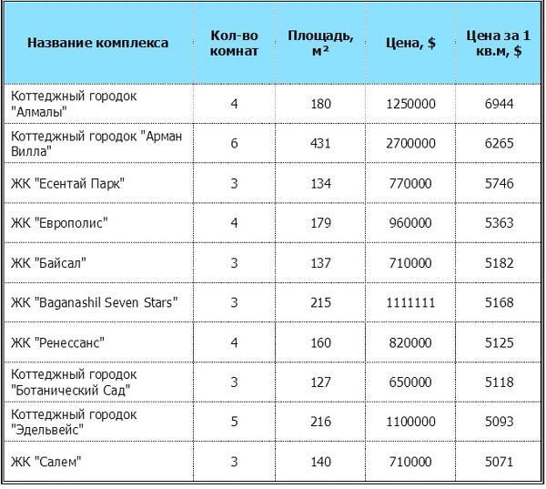 В топ-10 самых дорогих жилых комплексов в анализируемом месяце попали: коттеджный городок «Алмалы», коттеджный городок «Арман Вилла», ЖК «Есентай Парк», ЖК «Европолис», ЖК «Байсал», ЖК BaganashilSevenStars, ЖК «Ренессанс», коттеджный городок «Ботанический Сад», коттеджный городок «Эдельвейс» и ЖК «Салем». Здесь средняя удельная цена предложения находится в диапазоне $5070-6940/кв.м.